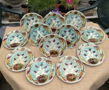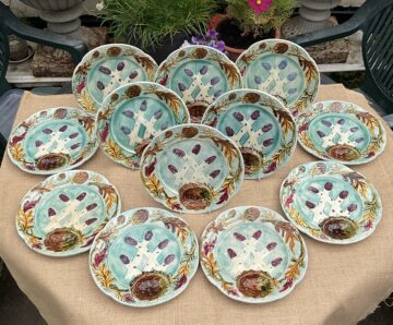 SET 12 FRENCH MAJOLICA ASPARAGUS AND ARTICHOKE SERVING DISHES c1880 Lisa King July 5, 2024 July 5, 2024