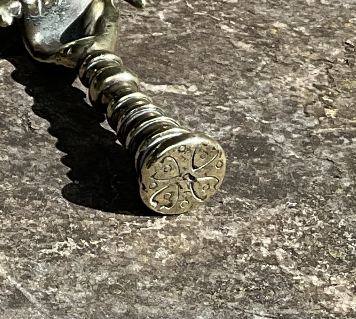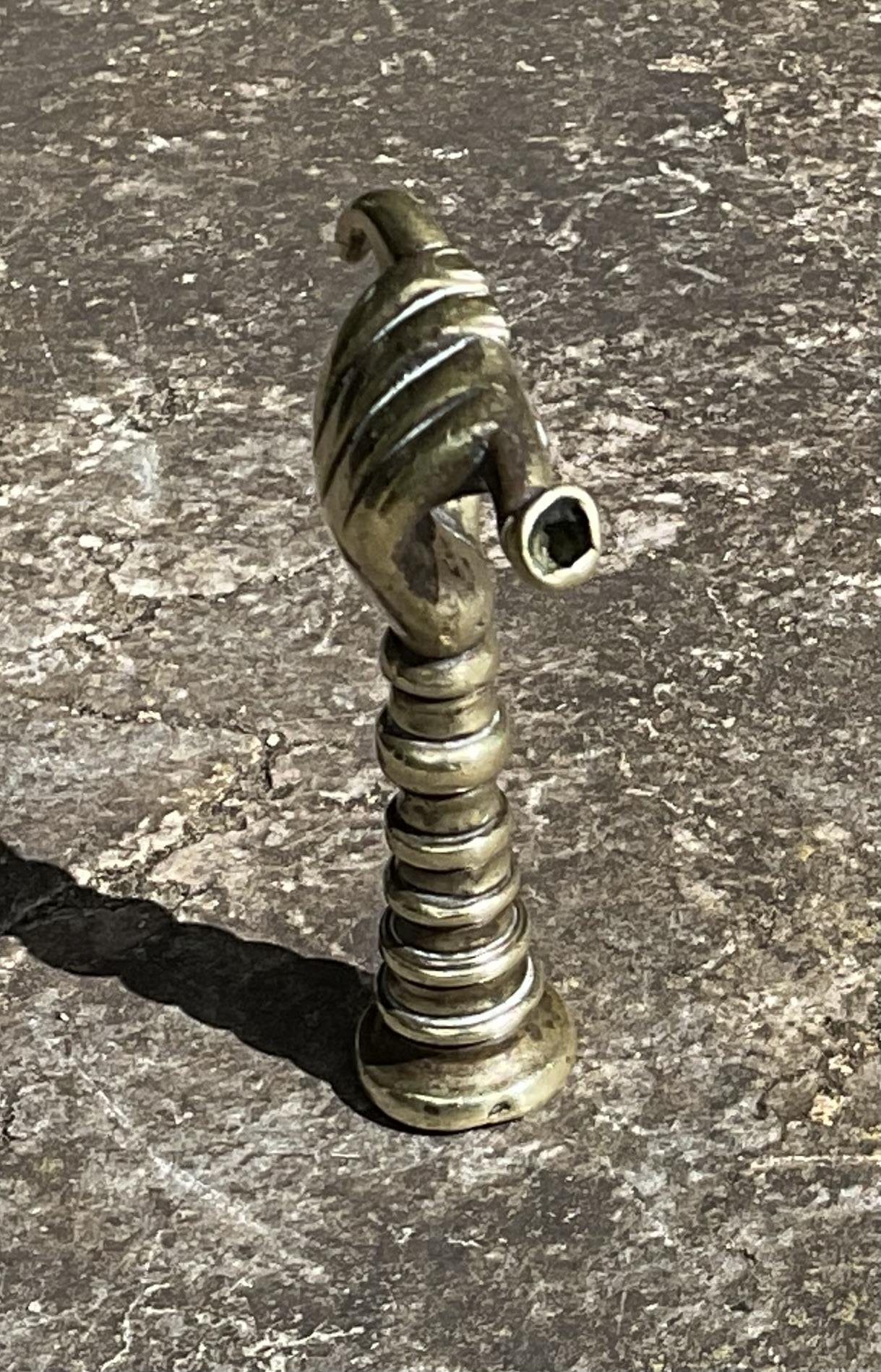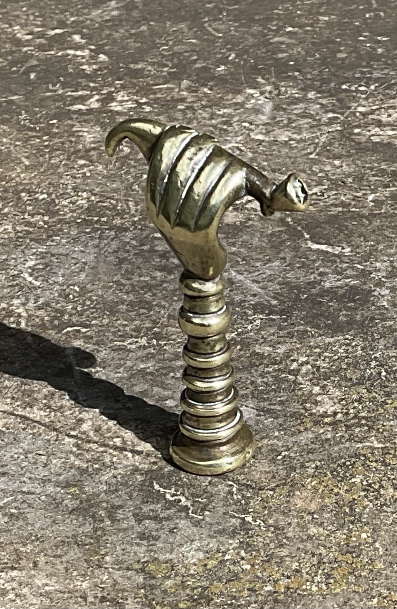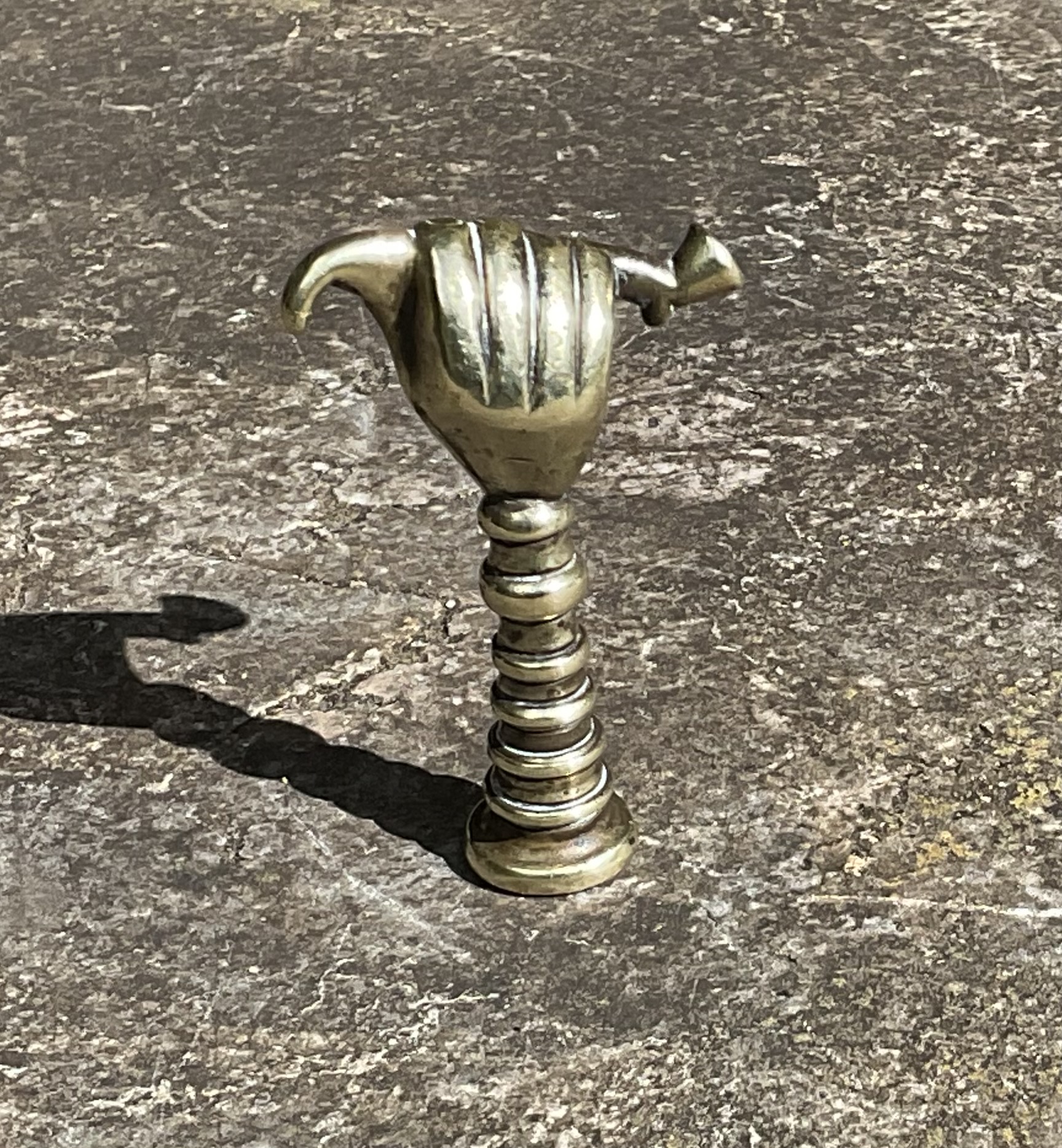 This Fine Brass Pipe Tamper, modelled as a hand holding a long pipe on a finely ribbed column, dates from circa 1860.