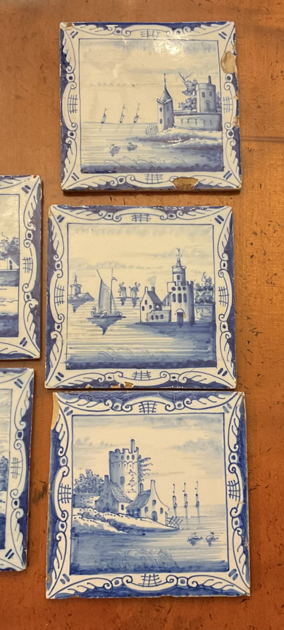 There are some nibbles to the edges. The photograph shows the three tiles with the most obvious chips. One of these has had a corner reglued (please see close-up photo).