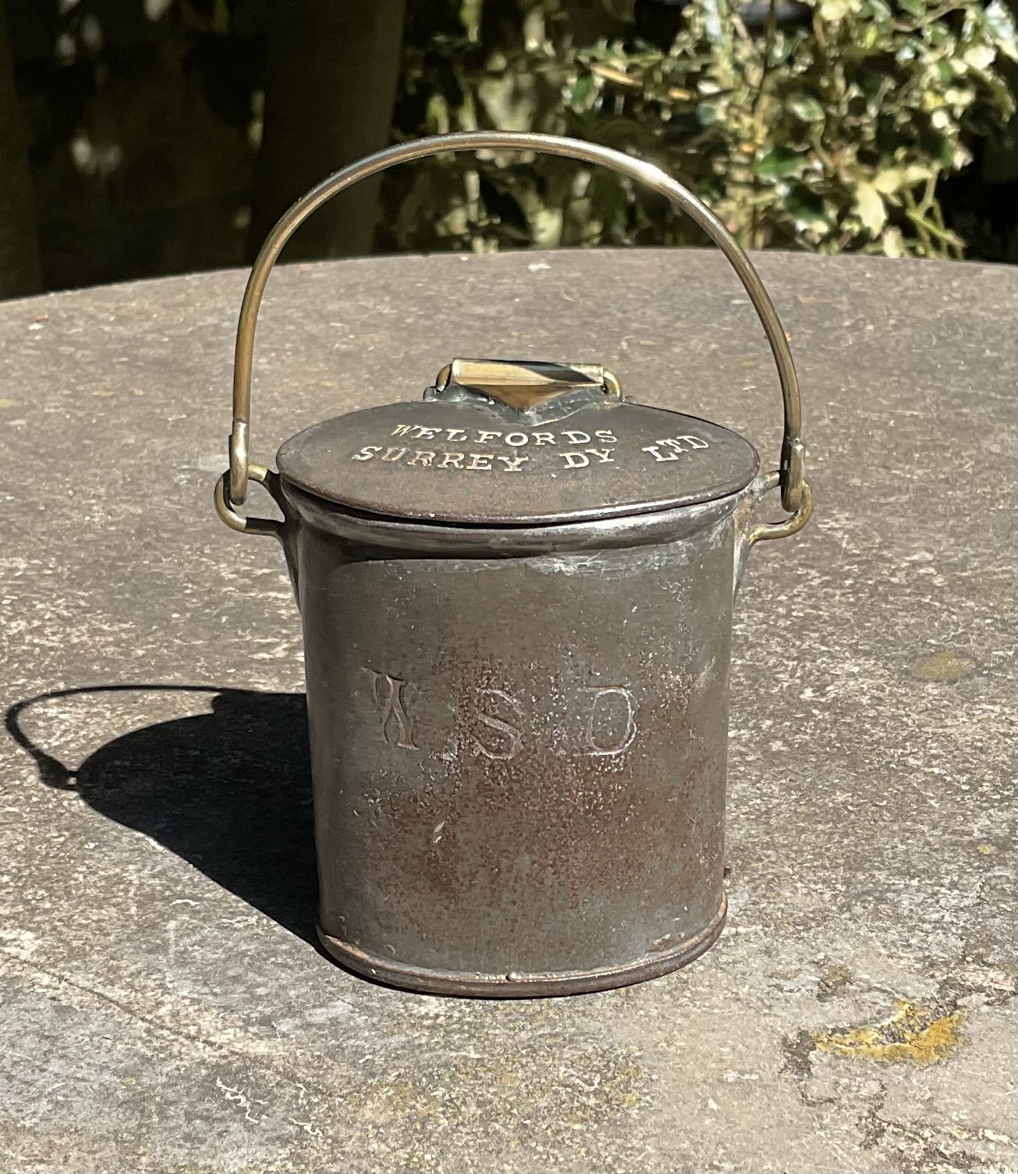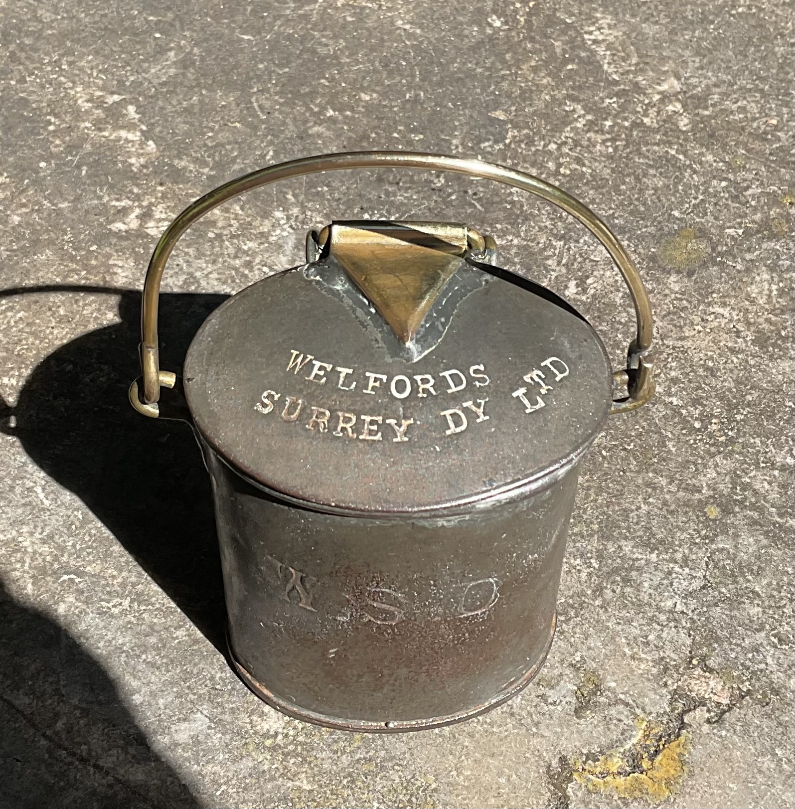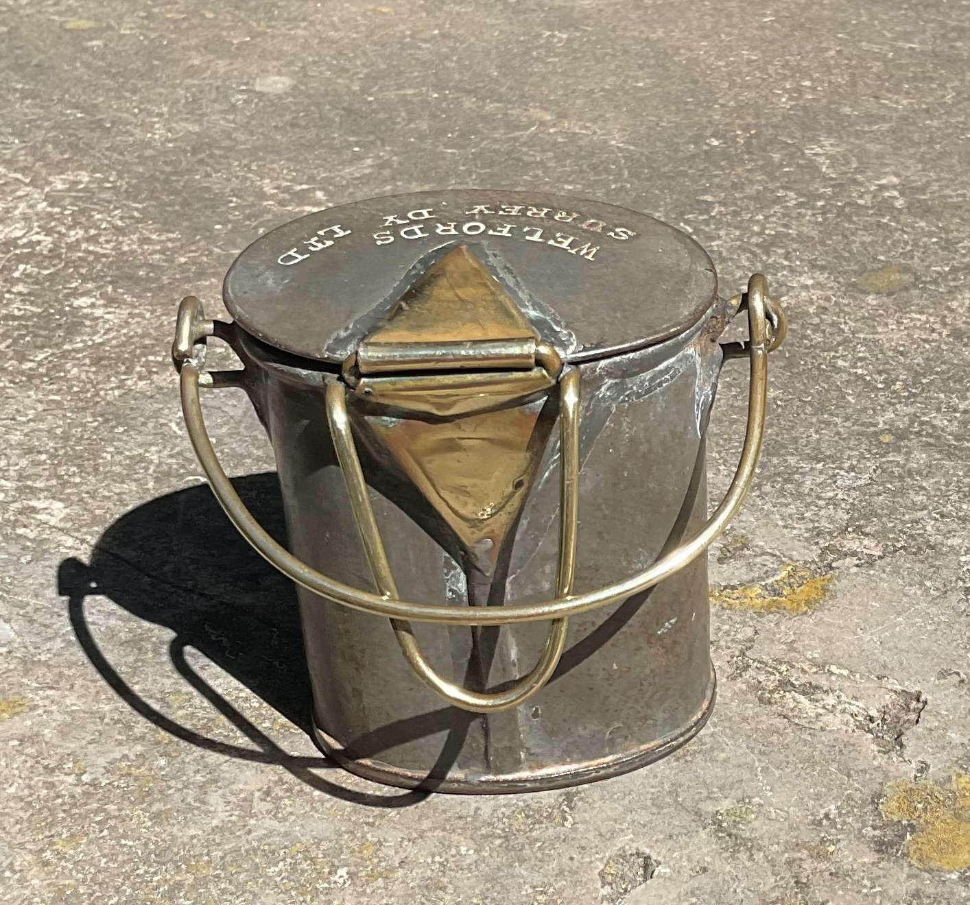 This charming metal and brass Cream Can is stamped WELFORDS Surrey Dairy Ltd to the top of the lid and with the initials WSD to the front.